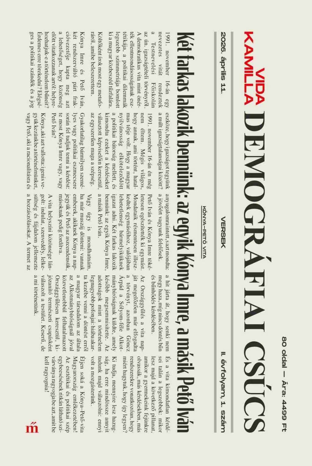 Még sosem volt ilyen vidám az illúzióvesztés, mint Vida Kamilla verseskötetének lapjain! Aki ezekben a szövegekben beszél, már nem pályakezdő, de még nem középkorú: tudja, hogy amit másokon számonkér, azt előbb-utóbb rajta is számonkérhetik. Itt és most szól, de tudja, milyen közelmúlt van mögötte, és tudja, milyen jövőt remél. Nem véletlenül lesz a könyv vezérmotívuma Kónya Imre és Pető Iván 1991-es vitája a történelmi igazságszolgáltatásról: Imre és Iván, mint két testvér, a mindenkori történelemben rejlő két erőként jelenik meg a versekben. Náluk is fontosabb azonban, hogy mit tanulhatunk tőlük. A történelem itt van, és soha nem érhet véget.